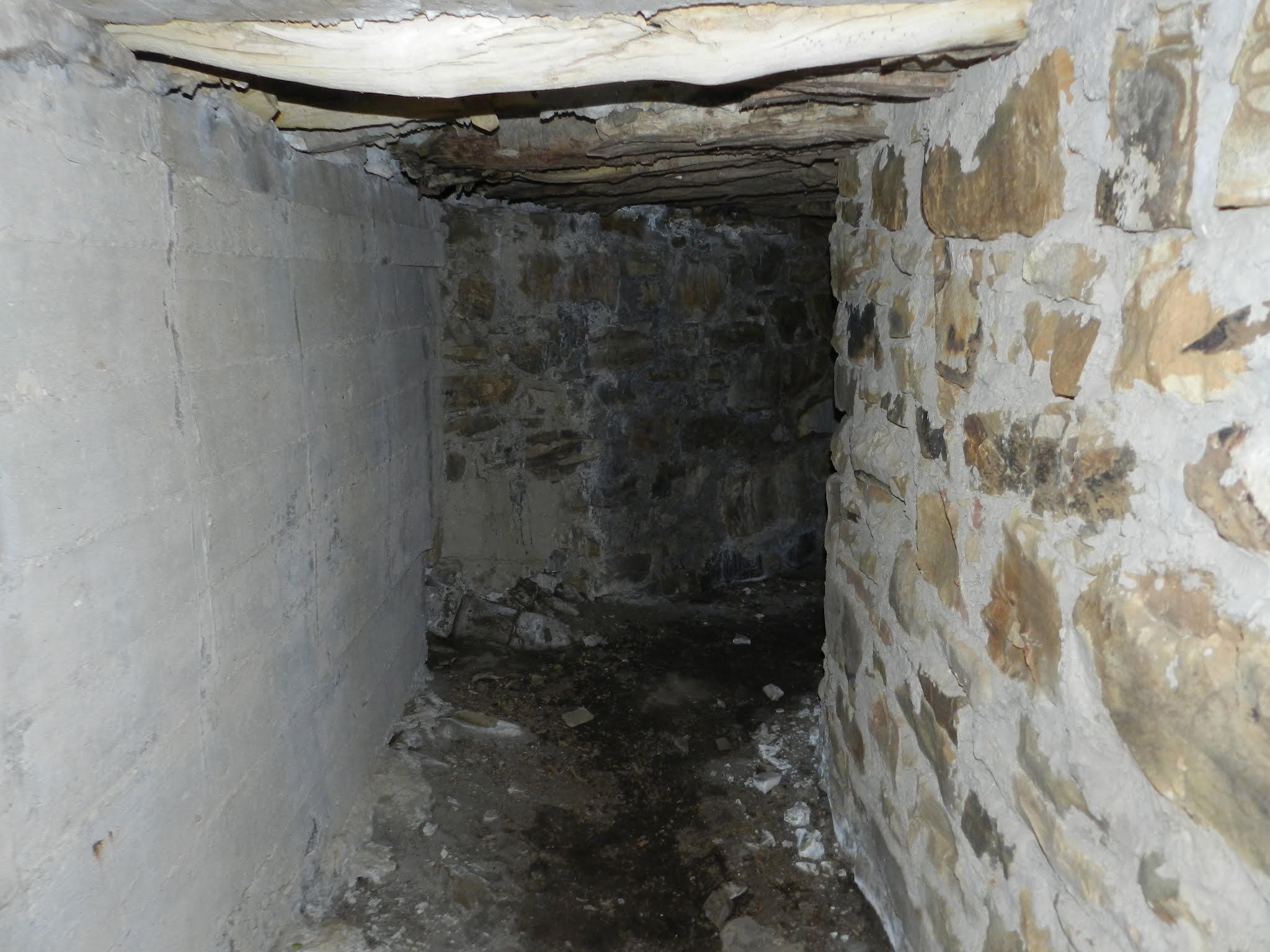 Foto 12: Mezcla de: pared de hormigón y pared de piedra con cemento. Entibado de madera de abedul. En el exterior, el recubrimiento superficial es de piedra, no lleva hormigón. Esto explica la filtraciones de agua y la formación de espeleotemas, en condiciones artificiales, en su interior.